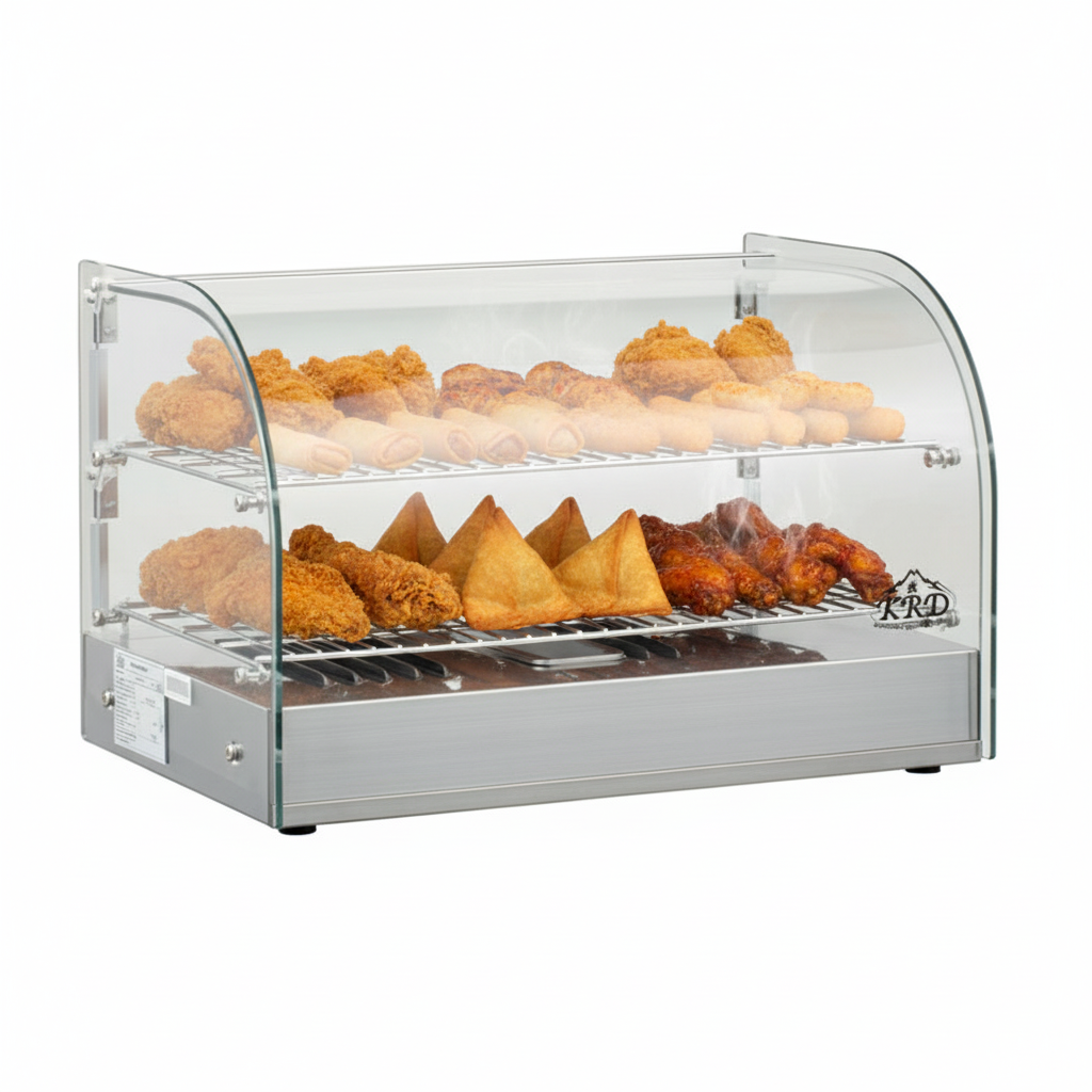 KRD 2 Tier Curved Front Heated Display Case 45 Litres Countertop XCR45L with stainless steel and glass design for restaurant and catering use.