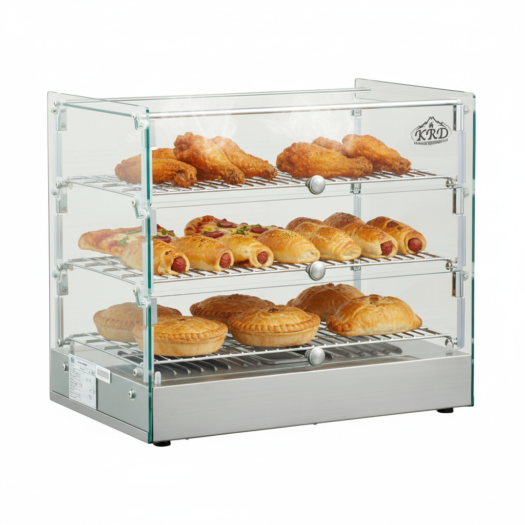The KRD commercial countertop heated showcase food warmer with a built-in water pan, this unit keeps pastries warm and fresh without drying out, while the temperature can be easily adjusted with the dial controls for accuracy and precision. The lift and slide doors ensure quick access to the contents and prevent contamination, promoting good food hygiene. Made with strong glass and stainless steel, this pie cabinet is highly durable and easy to clean, making it perfect for busy commercial environments.