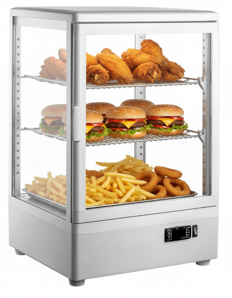 KRD Countertop Four Sides Glass White Heated Display Cabinet Warmer 58 Litre two shelves