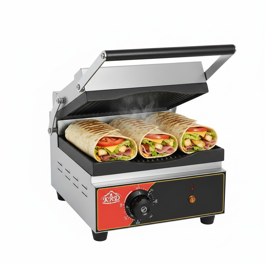 Grill your most popular sandwiches to perfection with this multi contact panini sandwich grill! This grill features ribbed enamelled plates to evenly cook sandwiches and leave tantalizing grill marks on the bread. The thermostatic controls let you adjust temperatures so you can cook at the perfect temperature, while the stainless steel exterior frame ensures long-lasting durability. Great for grilling paninis, sandwiches, bread, and even hamburgers and quesadillas, this versatile grill will add variety to your establishment!