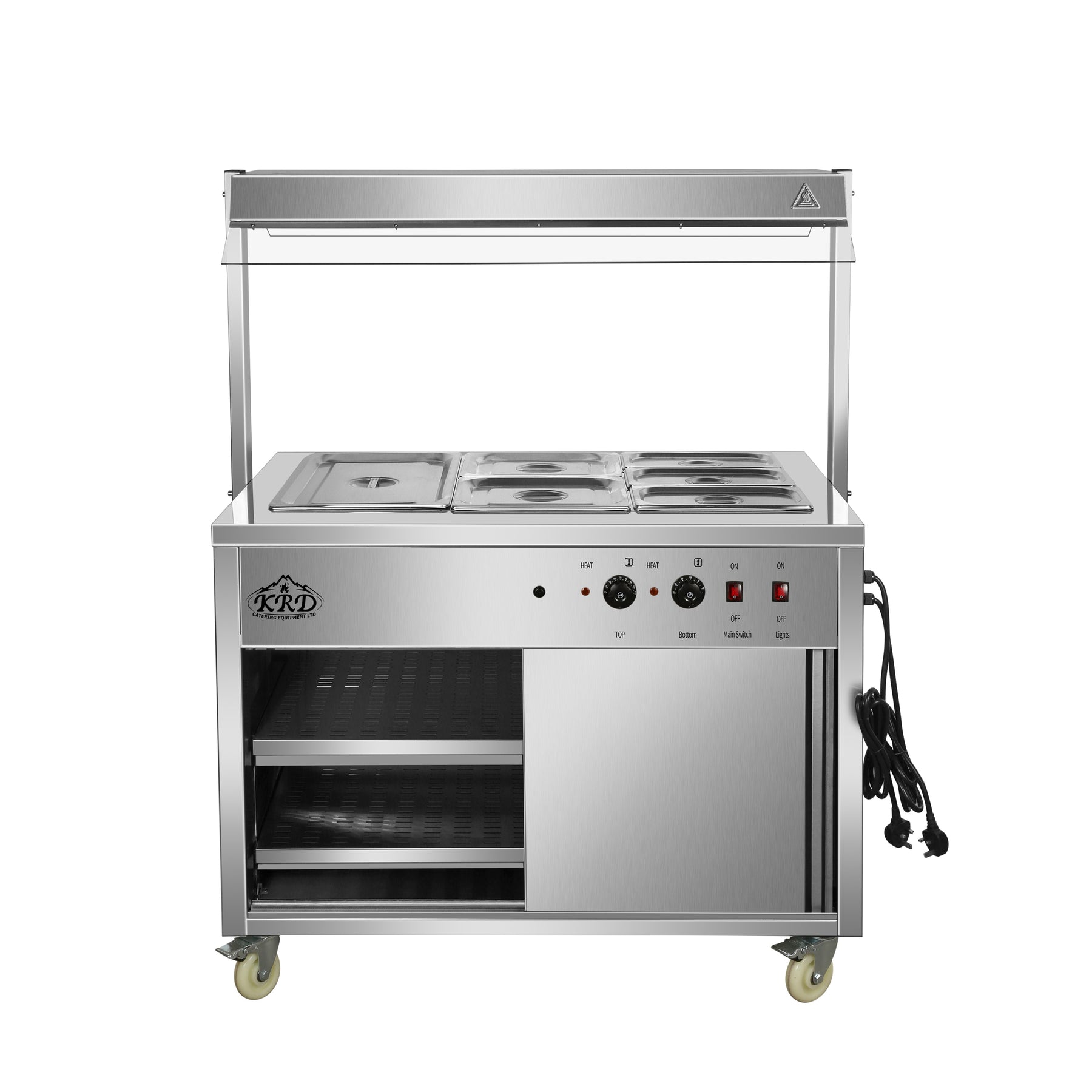 Enhance your catering establishment with the KRD Professional Bain Marie Showcase Heated Display Hot Cupboard, designed for hotels, restaurants, and buffet displays. This versatile solution includes a top Wet Bain Marie with 3x 1/3 Gastros, 2x 1/2 Gastros, and 1x 1/1 Gastro (included), as well as a spacious hot cupboard below for keeping plates warm. Both can be independently operated with their own switches and thermostats to ensure maximum efficiency and convenience.