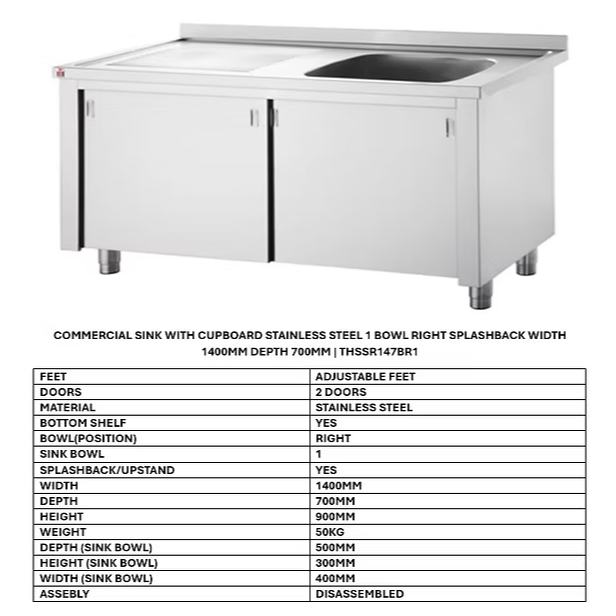 Sink with Cupboard Stainless steel 1 bowl Right Splashback Width 1400mm Depth 700mm ECSKC147BR1